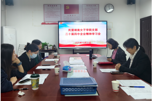 本网讯(社会发展学院 刘薇珊)10月31日,民盟湖南女子学院支部在学校办公楼415会议室召开专题学习会,集中学习党的二十届四中全会精神。会议由支部组织委员刘薇珊主持,支部成员宾艺涵、戴中华、张瑾、肖云、张诗雅等参加学习。